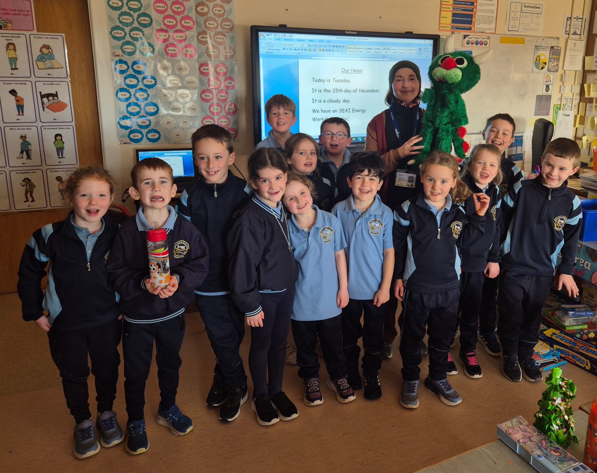 Míle buíochas to Áine for delivering an SEAI Energy Workshop to all pupils in the school. Guzzler the puppet who likes to waste energy paid a visit to pupils in the Junior Classroom and pupils in the Senior Classroom and Autism Class had opportunities to explore and discuss sustainable energy through energy experiments and playing energy games.